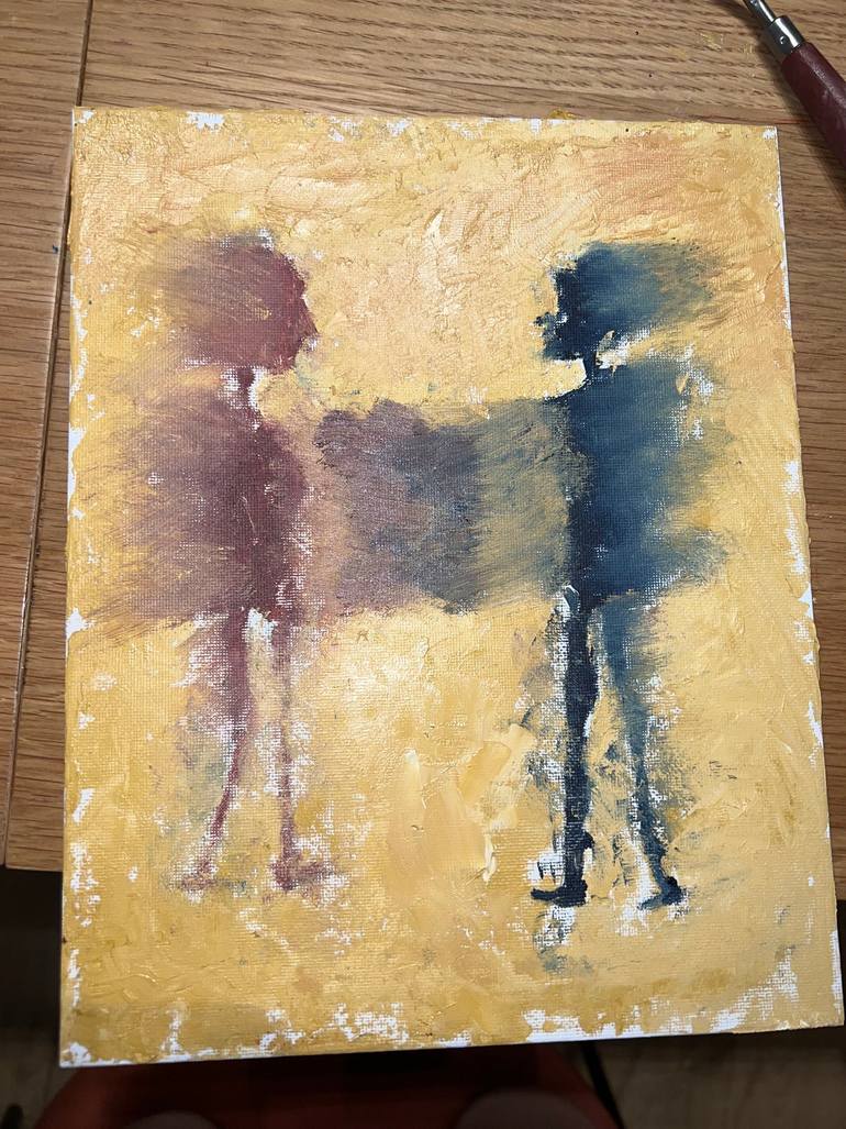 I want to connect the silhouettes of a male and a female body figure to convey gender fluidity. I used spatula to paint the back drop to contrast the faded visual of the theme figures.