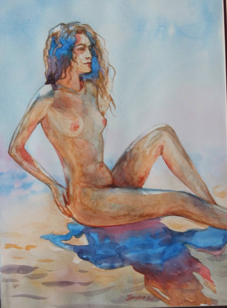 A beautiful nude woman on a sunny beach. This is not a print, real watercolor artwork that you can hang on the wall. Unique custom glass frame is included. I will creafully pack it and ship it to you, shipping price in US is on me. Ready to ship now.