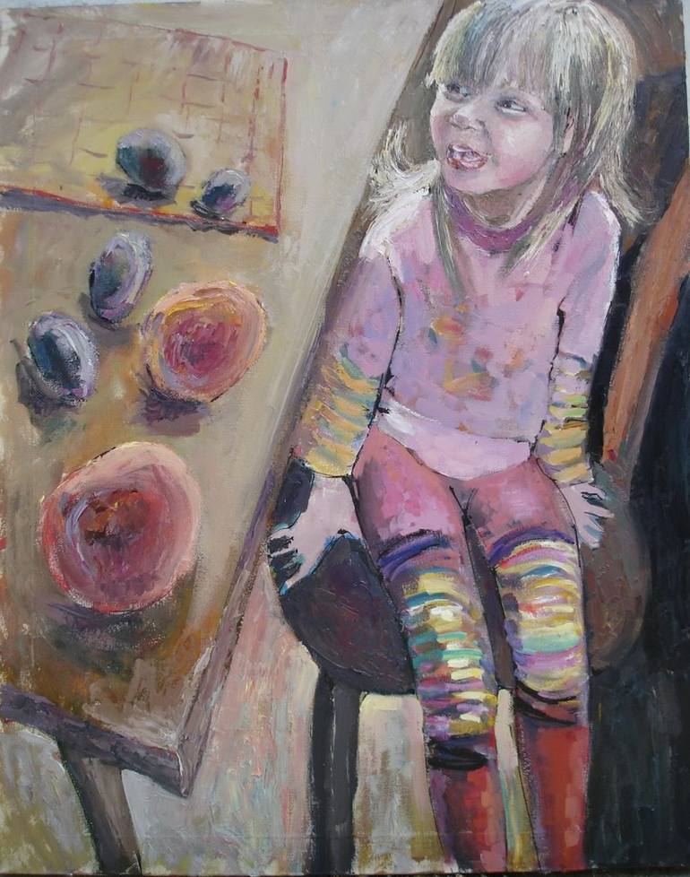 Girl that likes to be greedy on the table are fruits, which she doesn't want to give. portrait of the daughter.