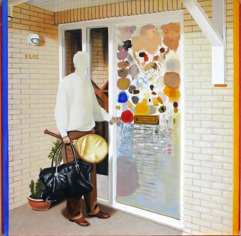 100x100 from nine to five No separate palette used, but put it directly on the canvas ; and (at the end of the day) I cleaned my brushes on the canvas (“green-art”,”eco-art”). Recycling ; resources(palette)-product(image)-wasteproducts(cleaning the brushes). Relation abstraction(palette+cleaning bru...