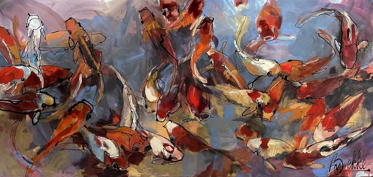 Het gaat over de prachtige onderwaterwereld en de verbinding van onze mens met deze ongrijpbare dimensie. De krachtige fascinerende kois. Ik hou van de bewegingen, de glitters en een volle vijver. Verander het en transformeer de scène en kleuren in hete abstractie. Gold touches. De reden voor het ma...