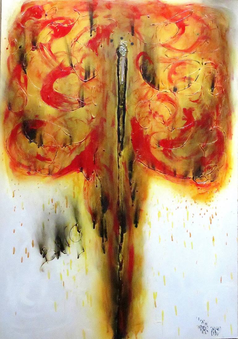 The Beauty of Burning In ABBA’s work, burning becomes both sign and language. Within this chimeric and hypertrophic figure, soot rises to a spiritual substance — a residue, a testimony of an existence that burns. Matter itself becomes memory, a reflection of a personality long consumed beneath the surface. The artist invites a suspension: one feels gently led into a muffled, weightless space, where thought and body drift between dream and trance. It is a pop and dissonant world — that of contemporary society — which demands that human beings react, or pretend to react, to the endless wars that surround them. In this fragile, interior landscape emerges a slender figure, a semi-empty shell, almost a mask — a symbol of invisible struggle, of an intimate confrontation with oneself. ABBA’s pictorial research seeks a beauty that hurts: an incomprehensible, elusive, painful beauty. His canvases, scarred by burns and voids, narrate a mark that changes and twists but never disappears. It is an existential déjà vu repeating endlessly, an obsessive movement that multiplies the self into countless reflections, all trapped within the mirror of the subconscious. Through the reworking of images drawn from media streams — computers, television, social networks — the artist composes a visionary catalogue of humanity in decline. Faces and bodies are deformed, scorched, emptied, until they become relics of contemporary consciousness: fragments of humankind dissolving into its own representation. The origin of this poetics stems from a single image: the shadows of vaporized bodies imprinted on Hiroshima’s walls. Immaterial remains of erased presences — silhouettes burned by the explosion — become the visual echo of surviving souls. In them, ABBA recognizes the paradox of survival: disappearance as the ultimate form of memory. Within his language, fire holds a central role — both destruction and rebirth, erasure and testimony. It is the artist’s primal gesture: a flame that burns the surface, yet becomes the very medium through which life transforms. In fire, everything is consumed — and everything is revealed.