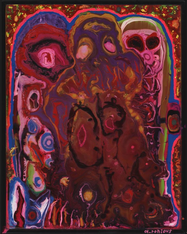 a_ronious is the artistic persona of Aaron Wetjen-Barry, a Boston-based abstractionist. my art is primarily made in two styles: one incorporates vibrant, hard-staining inks and paints intended for graffiti but used on clayboard or gessoboard in a psychedelic vein, versus the more stripped-down, expressive black & white work made with an ink dauber on paper or board. A long time record clerk and music obsessive, records always spin while I create and so I see the art and music as intrinsically, symbiotically interlinked. I make vinyl-to-cassette mixtapes documenting the music that inspires my art which can be enjoyed for free at my website in the section called '_ronitapes'.