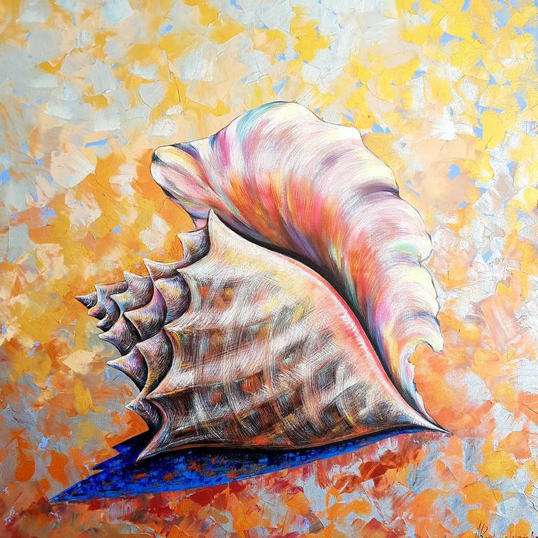 "Beach Queen" is an 80x80 cm painting that portrays a large seashell resting gracefully on sandy shores. Crafted with brush and palette knife, the artwork emanates warmth through its golden and sandy tones. The play of light and texture lends a serene charm to this unassuming yet captivating scene.