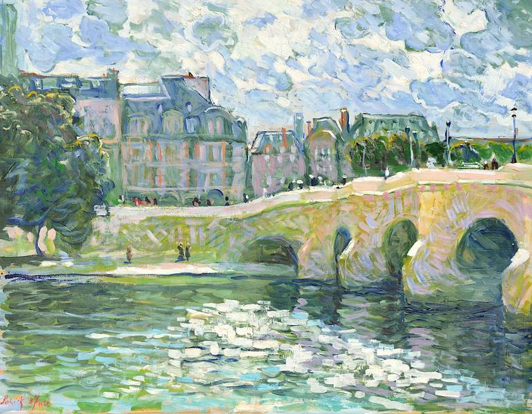 Contre jour fréquent sur le pont Neuf donnant sur la rive gauche de Paris. Toile faite depuis un dessin en atelier. . . ...