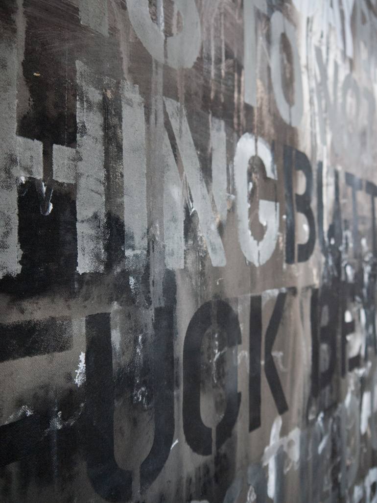 b 1971 UK Self taught artist working with many mediums but liking paint the best. Painting is just a language that I am more comfortable with, it has an honesty, it is what it is. My work is very unprocessed, direct, I don't see as I paint , just look at it sometime later, then start again or leave it alone until another time. I work with layers, building them up and scraping back, finding stuff I had forgotten about, the painting starts to get interesting, to develop its own past. The word paintings write themselves with no restraint, if I'm not sure I keep writing over, but ultimately the words, however buried, have been said.