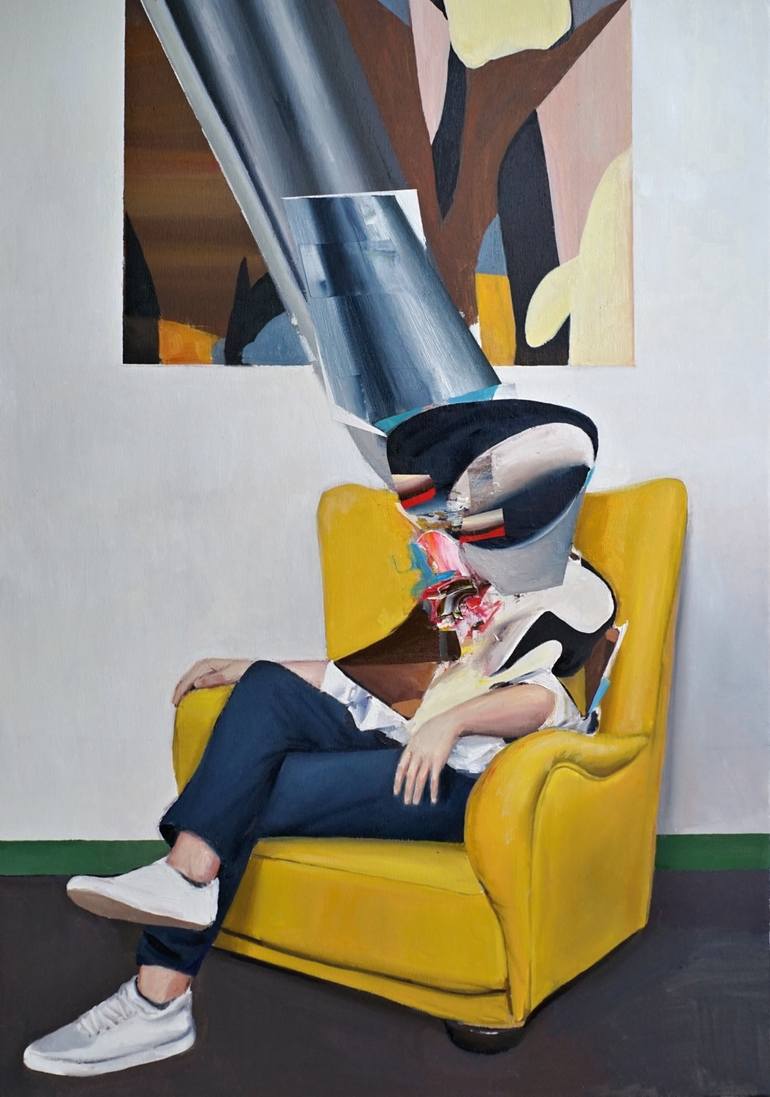 The painting presents a concept of personal isolation, which leads to madness and loss of human character, resembles Bacon's works, but is more "cut" and dadaistic. Dimentions 100x70 cm .Shipping in wood box.