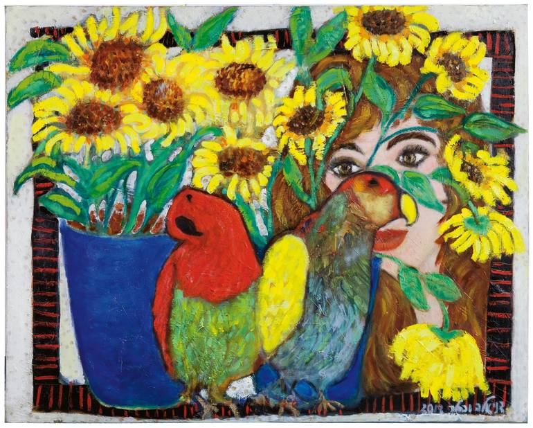 the third painting about looking, about faces, dream, birds,plants, frame, secret woman, color and feeling.