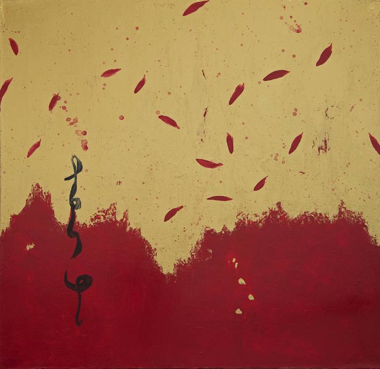Abstract painting inspired by contemporary Japanese calligraphic art. Can you read the calligraphy? It is in English but rendered in "kana" script. Please note that paintings that have metallic colours such as this one can look quite different in different lighting.