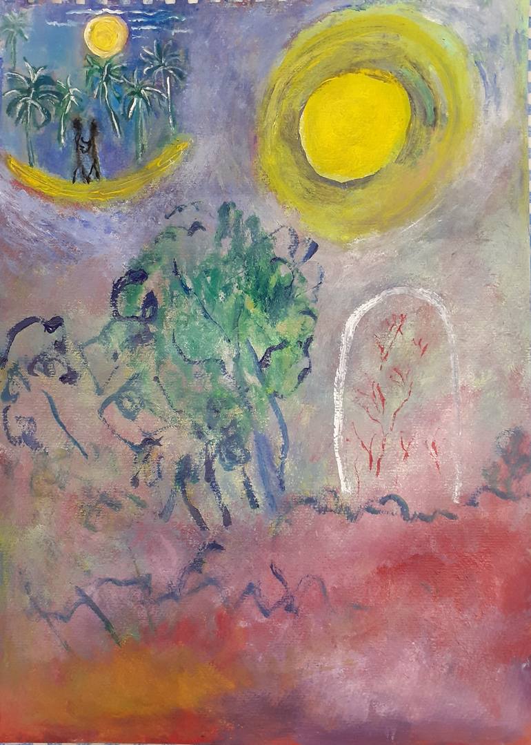 Only love is worth something in a world that is going not so well! and so in a blurred landscape, under the blazing sun I painted two lovers dancing on a fragile raft!