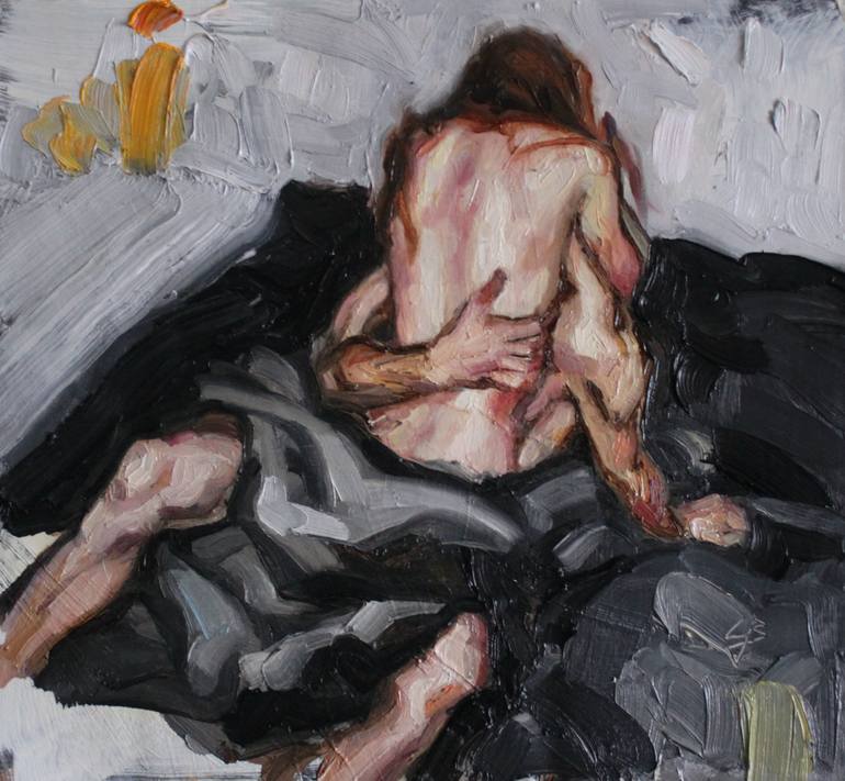 "Lovers" is a small original oil painting on canvas depicting lovers in bed. The predominant use of black and white adds a classic, timeless feel to this modern figurative piece. The artist's application of oil paints captures the raw emotion and intimacy of the couple's embrace, rendering their co...