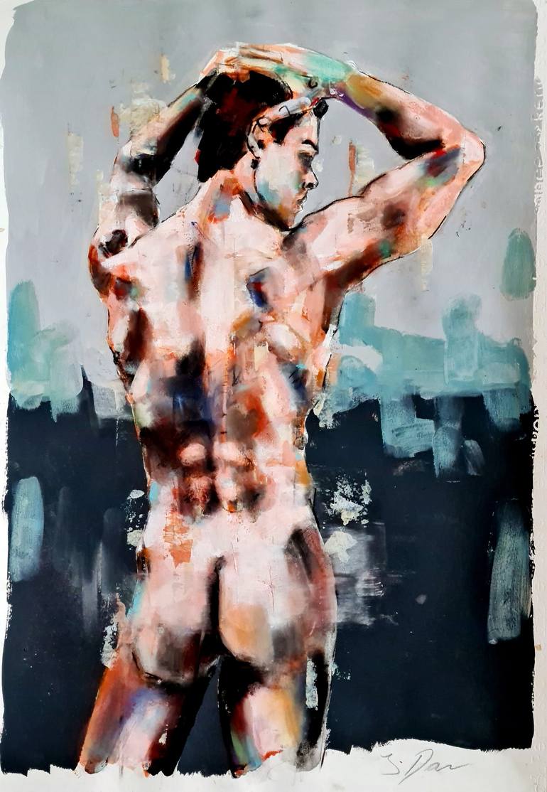 male back study 7-2-22 is a medium-scale male figure in inks, watercolours, Acrylic and soft pastels on 200gms paper. The use of fluid mediums such as inks, watercolours and acrylics allows for a certain element of chance within the drawing and are produced quickly using expressive marks and stains...