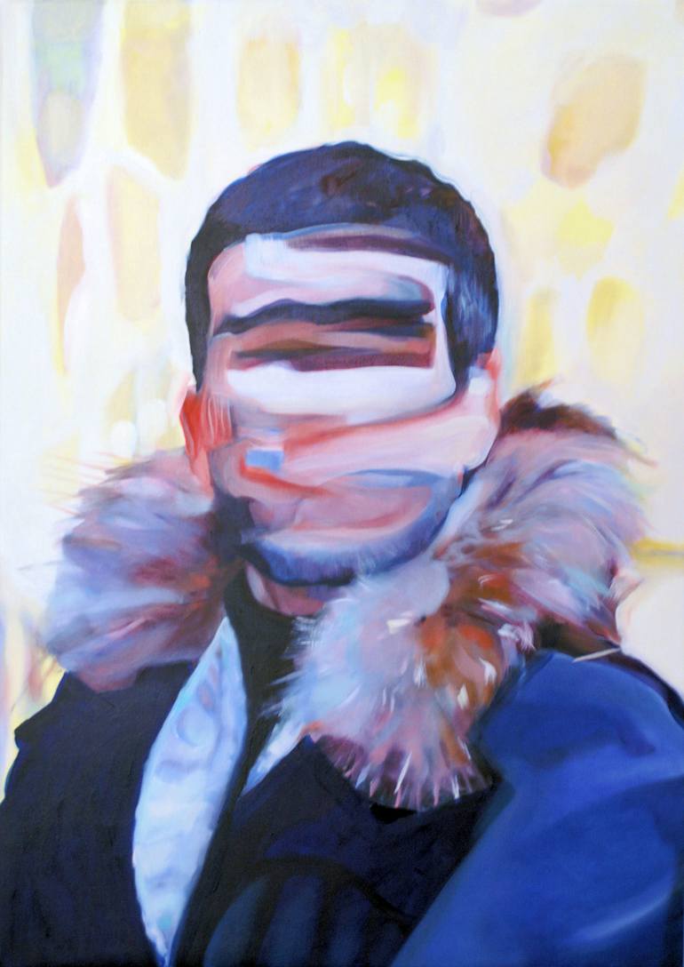 "Price: $365 – $16920 | 70 works available" I live in Brussels, I am a painter and painting teacher at the Academy of Fine Arts. The subject of my artworks is existentialist portrait, identity . In my paintings, the eyes are most often masked or unworked if you prefer. A theme as the hybridization of commercial and popular images drawn from the media and copy-paste for the realization of portraits such as evocations. The masks, here are made as pseudo-collages ( “pretended” cut collage but painted) The mask is a recurring motif, symptom, anachronistic displaced thing. It is a conceptual reminiscence. Mask is something, a form, that returns through cultures and ages and survives its own death. There is something pathetic about the masks which are like “capable of anything”. Painted as a collage in the artwork it creates a particular spatiality, enhancing the geology of the construction and the mutating aspect of someone as well. Combining intimism with hyper-mediated production, abstraction and figuration, the gesturality of pasta and the almost watercolored descriptive form.it highlights the construction assembly of various faces, various aspects of someone. From time to time a thick gestures of paint paste, traces; pink or black impasto, symbolic on a deliberately very fine, airy and flat material. The gesture erasing the eyes transforming the face in an effigy . Elsewhere, an insulating invading space, of almost monochrome colors, enveloping the subject, the background and the figure becoming entangled with a sort of melancholy . Appearance, identity, the subject is elsewhere, beyond representation. Colorful flowers , animals furs as playful figures surrounding and invading the human figure as a hope.