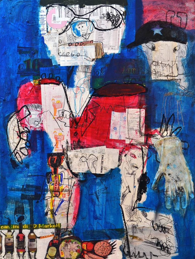 Silvano Bruscella born in 1974 in Sesto San Giovanni (MI - Italy). At the Art Institute of Monza he achieved the diploma and in 2001 he achieved the degree in Architecture at the Polytechnic of Milan. After a brief period of collaborations with some architectural firms, in 2003 he attended the School of Art Therapy Training Centre "La Linea dell'Arco" of Lecco, deepening the bond between the two disciplines and organizing workshops, creative and for support to the architectural project. In 2006, after meet with Mrs. Laura Ramoino, Mr.Bruscella enters as permanet at the Gallery "Le Tele Tolte", participating in exhibition where the artist, whose name is deliberately hidden, accompanies the observer in the work and concept represented. In 2007 he exhibited with the collective exposition "In-Visibil-Arte" at the Museum Angelo Rizzoli of Ischia and in the ex-convent of Santa Chiara about the XXXIV Award of Sulmona invited by Prof.Giorgio Di Genova. In the same years the work focuses on the cyborg image, means as improved man by external technical and technological components, and presents the results of research with a personal space Sottovuoto of Milan. In parallel, he also began to experiment with the collage technique, recycling various types of paper (advertising, bags, receipts, etc ...) using it to expose waste and social problems. In 2008 he joined with the Movimento Innaturalista, thus declaring the refusal of the art system and expressing an opinion strongly negative towards the art of the last half century. Since 2010, describes his work as the result of continuous "coincidences", where the signs , the colors, the shapes, the materials and the dazzling illusions are mixed with frantic gestures and bring out the figures that animate the stories of his painting. Mr.Bruscella continues to present their work in graphic and pictorial solo and group exhibitions in Italy and abroad as they were pages of a diary, finding appreciation by the public and critics alike. Silvano Bruscella lives and works between Milan and Gaeta (italy).