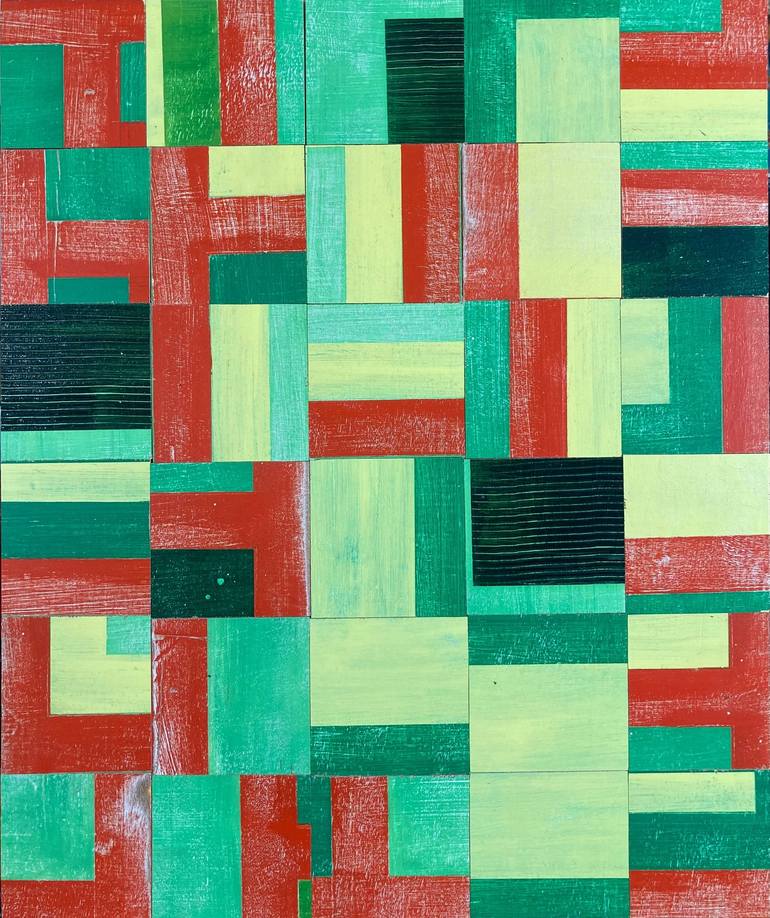 One of a series of paintings deconstructed on a table saw then reassembled as a mosaic. I sawed the original painting into 4" square tiles then reassembled it almost randomly. Acrylic paint on wood panel mounted onto plywood. Signature, title, date and artist inventory number on the back. Custom-...