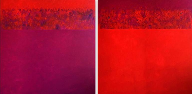 Abstract planes of intense color dissolve and merge, creating a floral impression. Diptych with two canvases (each 90 x 90 cm) which should be displayed next to each other with a slight space between them. Original acrylic painting.