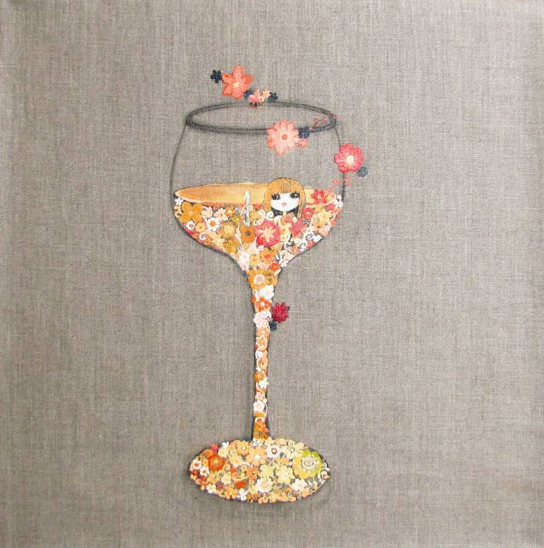 Oil on canvas. 50cm*50cm, a glass with flowers and cartoon girl on.