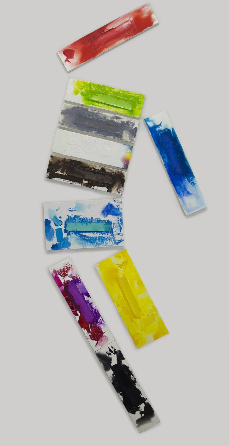 The painting has two color models: rgb (red, green, blue) and cmyk (cyan, magenta, yellow and black). rgb is used in light media and cmyk is used in printing. Each panel has a printed color swatch (two in the cmyk panels) as a 'standard' and then oil paint colors applied to 'match' the standard. T...