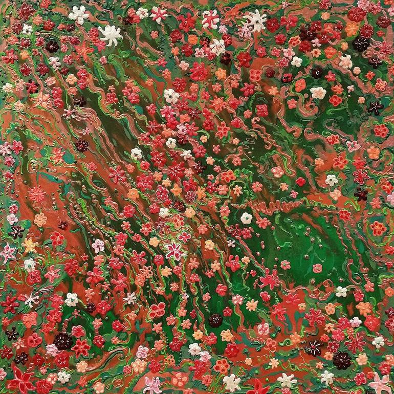 this is the last of the Rhapsody series paintings based on the same garden series. The copper and the rose gold colours set the mood of Autumn. They are designed to be together but I am very happy to split them. Acrylics and oils on canvas. 48 inches by 48 inches.