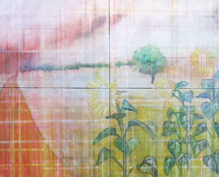 A purple rain coming up, sunfowers observe it. The horizon separing the uo and the down, the background and he foreground seems to dissolve and let the behind and the above threw. Quadtych: Four canvases 31.50" x 39.40" (80 cm x 100 cm) each.