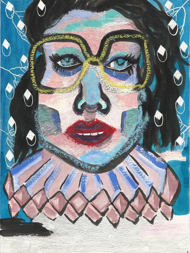 Self-portrait in mixed medium. I was exploring new mediums and perspectives to create a portrait. The face was created using broad brush strokes, entraped in thick black lines, to make an immediate image. I added wobbly ink lines onto the face to delineate the volumes within a face. I also like ruin...