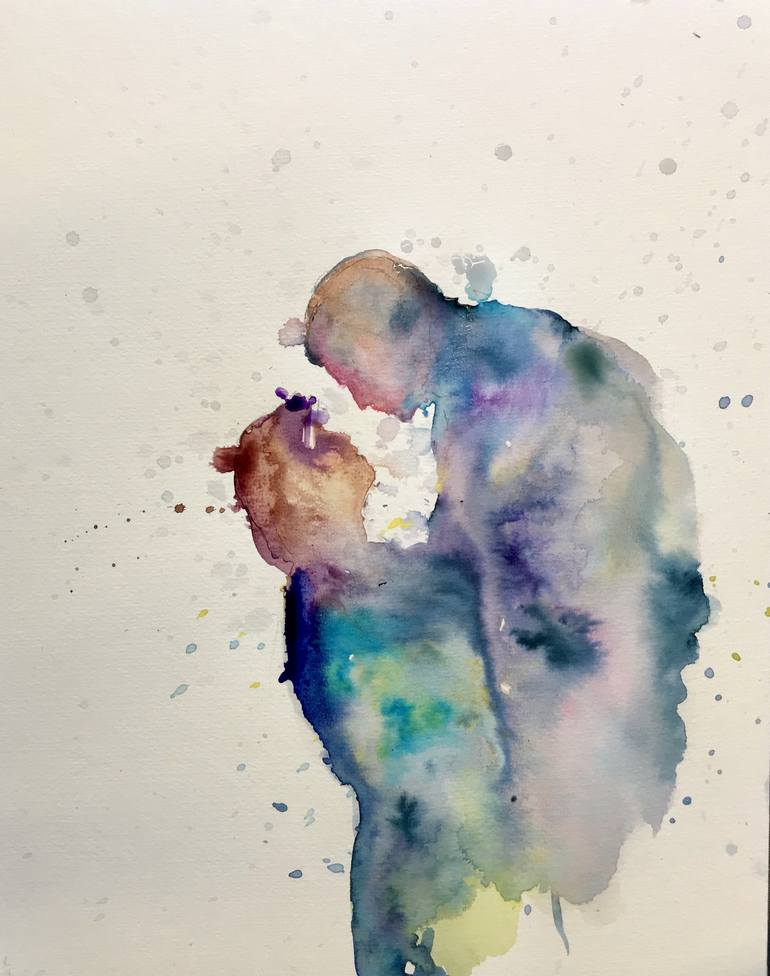 Here, the wet technique was used to mix the colors of woman and man. The goal is to emphasize the intimate relationship between two lovers. They feel that every part of their body belongs to each other, their spirit as well. this art work is unframed