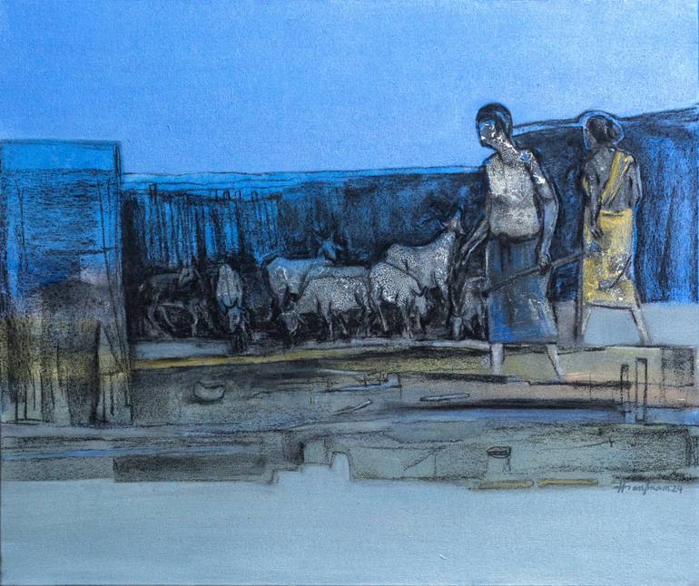 Two figures appear to be walking, one following the other, against a backdrop featuring a group of animals that resemble sheep. The foreground shows various lines and shapes that could suggest an abstract interpretation of a landscape or objects.
