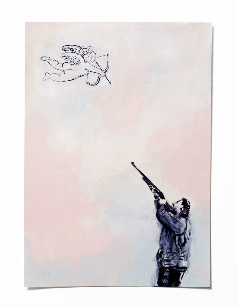 A cherub angel ist aiming with his love arrow on a male figure, that is simultaneously aiming at the angel.