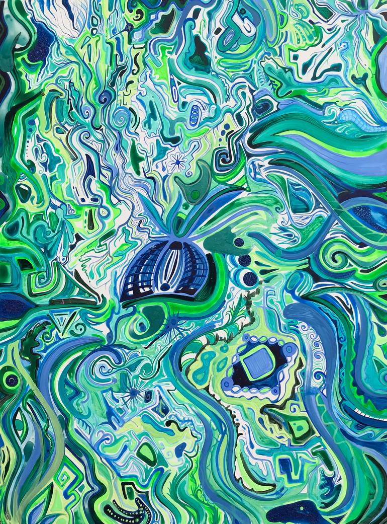 Alive and growing immersive juicy garden breathing beneath the sun in a cool environment. Acrylic painting on wood.