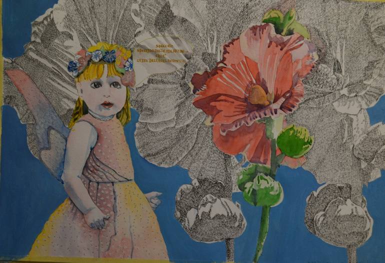 Poche cose ci rendono piacevole la vita, la mia è allietata dai bambini e dai fiori. Per questo amo dipingerli e disegnarli e in questo quadro ho voluto mettere a confronto il mio fiore preferito, il malvone con una bella bambina che fa la domanda della matrigna di Cenerentola" Specchio, specchio d...