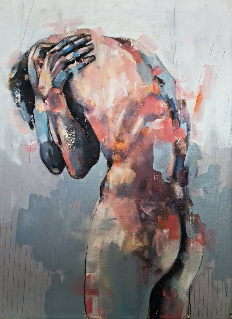standing figure 4-28-24 is a medium-scale male figure study on canvas in oils using a muted palette contrasting with areas of vibrant color. The work is painted with a fluid application of paint, staining, and stripping back allowing earlier paint layers to be visible. Utilizing bold, expressive bru...