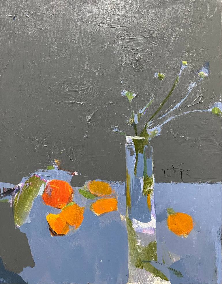 The painting is painted with acrylic on canvas, the size of the painting is 40x50cm. The painting depicts a vase of flowers and orange fruits.