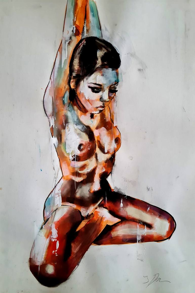 stretching 2-14-25 is a medium-scale female figure in inks and soft pastels on 200gms paper. The use of fluid mediums such as inks, watercolors and acrylics allows for a certain element of chance within the drawing and are produced quickly using expressive marks and stains, giving them an ‘imperf...