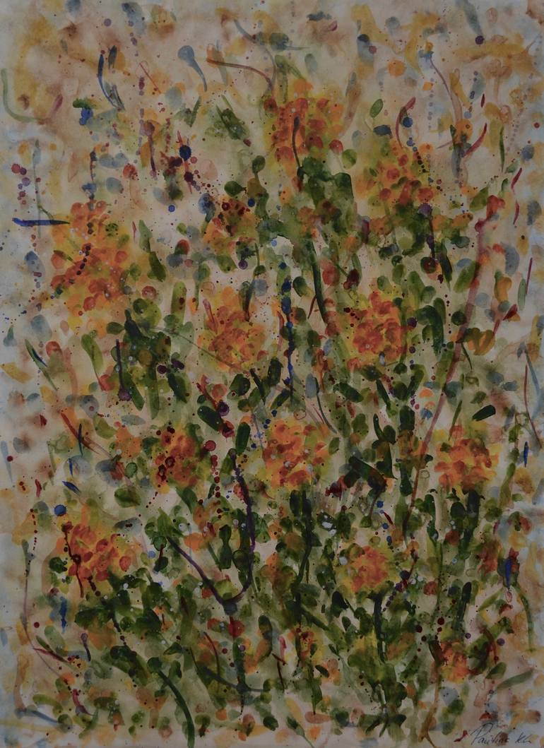 A really summery, colourful watercolour abstraction. It depics orange flowers gathered in a bouquet. Apainting that will always remind you of the warmth of summer and the smell of flowers.