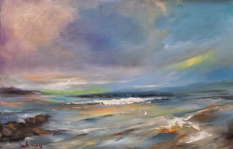 The original painting of a sunset near the shore is the artist's feelings about natural phenomena, which is a combination of the sky with many spaces of clouds and the sea surface, depicting the phenomenon of reflection with painting emotions. acrylic For artists it is a beautiful painting in the so...