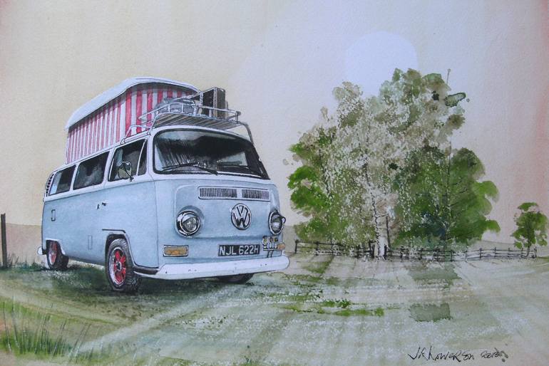 A signed original watercolour landscape featuring a classic Volkswagon T2 Campervan in the hills on a July morning