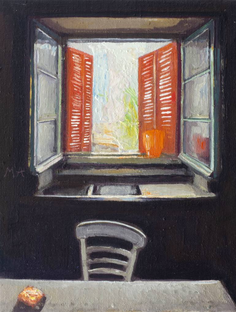 temptation, belongs to the series of paintings inspired by spaces, rooms and in the book by Gaston Bachelard, poetic of space They are small format 35 x24 x 2 cm, looking for an intimacy with the viewer The style is realistic, it is a paint sketch.