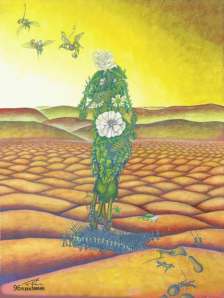 My name is Abderrahim BENJABBAR. I was born in Safi and raised in Essaouira. I have loved art and drawing since childhood. Since my birth, I found myself sitting next to my father, who was passionate about drawing. My father was a businessman who owned fishing boats, so most of his subjects were spontaneous scenes of boats accompanied by birds at sunset on the sea.. For these reasons, I found myself an artist from a young age. The second important factor that developed my relationship with drawing was my upbringing in the city of Essaouira, which, as you know, is considered the cradle of visual arts in our country. My small environment was my family, and my larger environment was the city. These factors were an effective motivation for me to become an artist without hesitation. As for my first real exposure to visual art, it was at the hands of the late visual artist Hussein Al-Miloudi, who noticed my talent and my innate desire to become a visual artist. He encouraged me, guided me on the right path, and taught me the meaning of visual art. He encouraged me, for the first time in my artistic career, to participate with him in a group exhibition of fine arts on the occasion of the Essaouira Music Festival 1981/1982. After these two steps, I entered the academic stage, studying art and obtaining my degree as a fine arts teacher. During my artistic career, and before becoming a fine arts teacher, between 1985/1986, I worked as a supervisor for the animation section at the Cinema Center in Rabat. Between 1987/1988, I worked at the General Printing Press of Souss in Agadir as a laboratory artist. I participated in numerous group and individual art exhibitions, and contributed to the creation and production of three-dimensional artworks ready for display. My artwork is measured first and foremost by the quality of the work, after diligence and deep thought, not by numbers. The subject must be chosen, which is a matter of suggestive power. After that comes the time to enlighten the idea and embody it in an artistic painting that combines the appropriate color to highlight the intended theme. I studied fine arts and know most of them, and my only concern was to try to break the phenomenon of imitation and ultimately arrive at my own style. Thanks to my improving health after a long struggle with illness that lasted nearly twenty years, I recently resumed painting in 2021, completing my first work after this period, which I titled "Giant Aura.