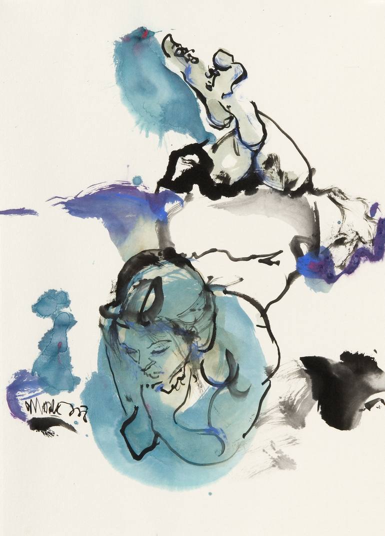 inkpainting, watercolors on wenzhou paper mounted on Fabriano paper sumi-e painting woman lying on the ground