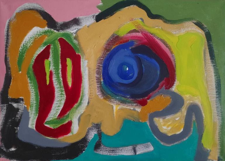 An expressionism semi abstract painting, suggesting a blue eyed elephant with a frozen smile. Even though he/she smiles his/her eye is reffering to another emotion. Looking directly the viewer asking for a dialogue. Few free hand forms invite the viewer to suggset his/her own interpretation of the c...