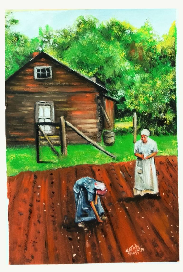 It's an oil painting on paper of two women throwing seeds on soil in front of their home with a vibrant trees and grass