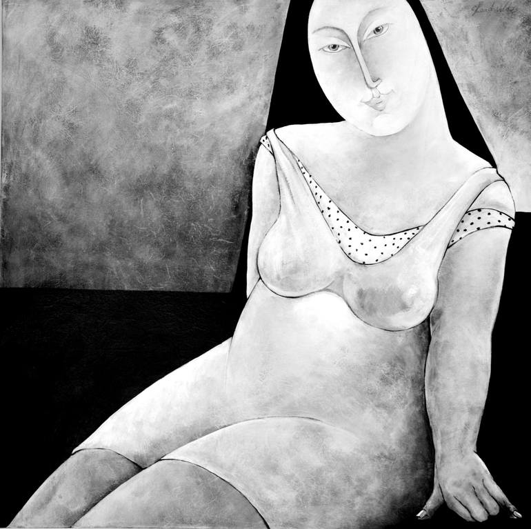 A black and white study painted on canvas using only 3 colours; black, warm white and a cold white. 100x100cm, 40"x40"