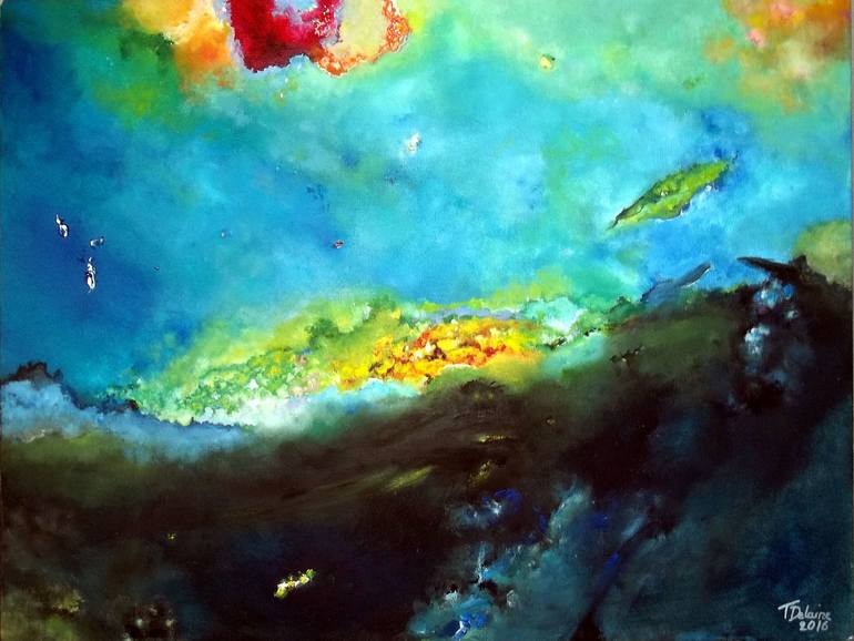 Theophile DELAINE is born in 1969 in Champagne. From his earliest childhood, his parents drove him around in Volkswagen minibus ; Greece, northern Africa, Afghanistan and Nepal, which marked him with a permanent desire for escape and freedom. At the age of 19, he went to Paris to study music at the University of Paris VIII and the conservatory. He already liked to draw but he discovered then the world of plastic arts and contemporary art of the capital. He then started to follow the curriculum Arts Plastiques at the university, visiting museums of Europe and elsewhere, galleries, exhibitions, sculpture on earth, on wood, collages, watercolor, chalk and many other supports. He will make many very enriching encounters. During all these years of learning, he nevertheless remained faithful to his double bass, following a classical formation and playing in jazz clubs. He will gradually end up abandoning music for brushes. At 23, he finally embarks on painting, working on technique, composition, harmony of colors ... At 26 he leaves to live in Crete where he enjoys drawing portraits of the mountaineers in the Kafénion. Throughout this time, he seeks to graphically express the need for freedom that characterizes him. Although he appreciates the expressiveness of Paul Rebeyrolles and the great sensitivity of Van Gogh, Zao Wou Ki's painting will ultimately be revealing. From there, at about 28 years, the pictorial adventure really begins. At 30 years old, he settles in Limousin, sets up a small workshop and paints - a lot, non-stop! He begins to sell paintings, takes up plastic art studies to perfect his theoretical knowledge and organizes his first solo exhibition. But it is not enough to paint to feel free, we must live it to paint it. Then, in 2004, he leaves again and expatriates to Madagascar where, for several years, his painting will flourish. He exposes very regularly in various places on the big island. At the age of 46, he leaves Madagascar for La Réunion where he exposes his pictorial reflections since the beginning of 2016