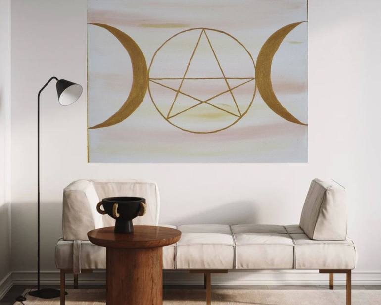Titre : Harmonie Lunaire et Mystique Cette œuvre représente un pentagramme fusionné avec le symbole de la Triple Lune , un puissant emblème associé à la spiritualité, à la magie et aux cycles de la vie. La Triple Lune, formée d'un croissant de lune croissant, d'une pleine lune et d'un croissant déc...