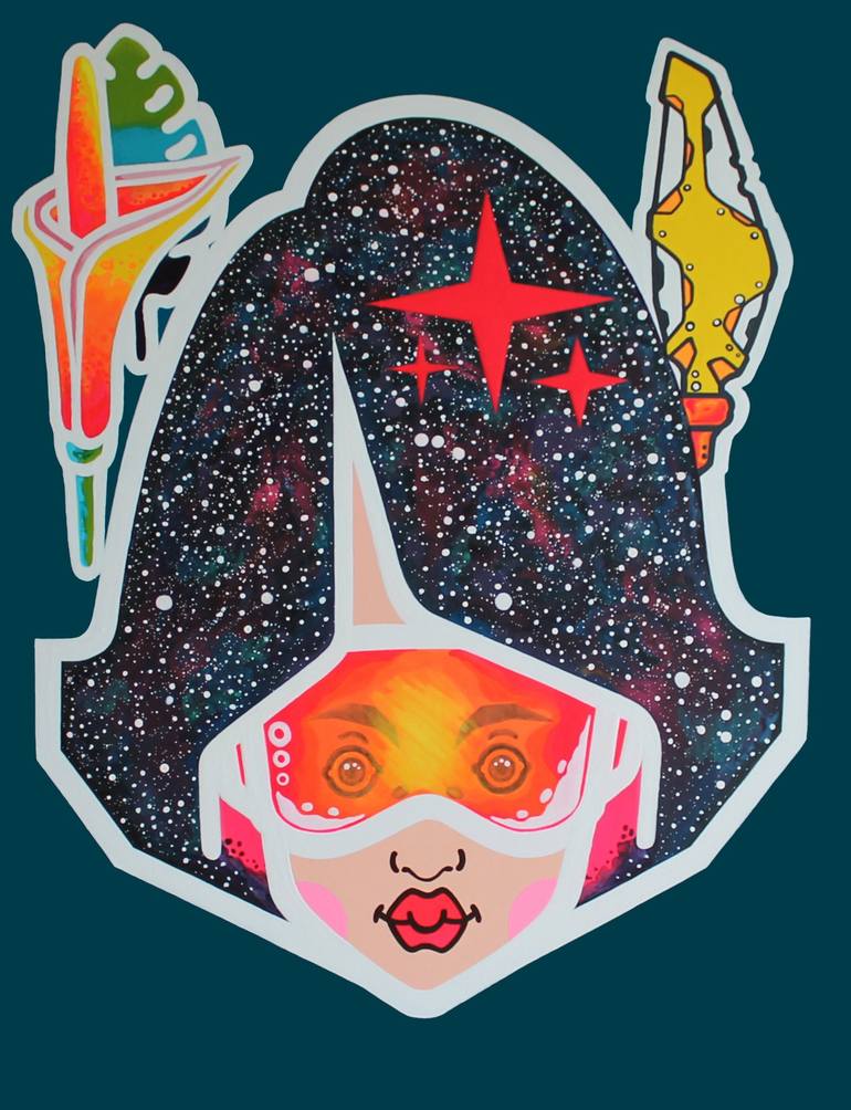 space series of works, tropical space the painting depicts preparations for a spacewalk and next to it tropical plants as a talisman and symbol of the strength of planet earth in its space adventures