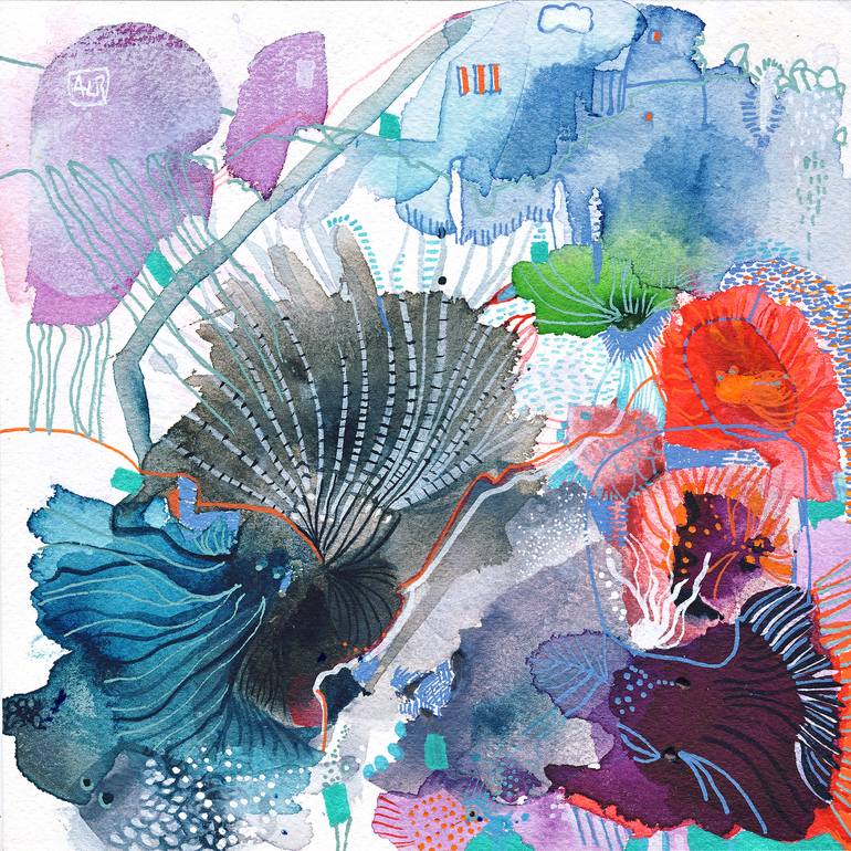Aurélia DUCERF was born near Paris in 1970. She obtained her DNSEP diploma from the European School of Art of Brittany (Rennes) in 1996. Interested by typography, sign and new technologies, she is first oriented in this sector by working as a designer ux / artistic director. In 1997/99 she works on research projects of CCETT oriented human machine interface. At the beginning of the internet she creates the junction of the print communication to the digital transition and sets up a coherent multichannel image for large groups, while creating software libraries, user interfaces, cms. She wins a prize for the best multimedia design at the 2002 nanteic show During this period she continues to do painting, illustration, and research projects with associations (especially on intellectual disability and deafness). She intervened at the University of Paris X in 2001 at the JaCoB seminar on "text / image reports in multilingual documents" (MODYCO laboratory, FRE / UMR 7114 CNRS / Paris X ); as well as in 2003 at the School of Art of Rennes "Specificity and nature of the production of information on the Internet" DESS "Creators of artistic and cultural multimedia products". In 2005, she returned to her first pictorial research. : first written signs of man; the emotion of the gesture, the improvisation. This research of ten years allowed her to sit down his pictorial research and brought it to New Caledonia where she has lived at the moment. In particular, his watercolors tend to question the viewer about his interiority, like one or more meditative breaths. While guiding the eye, it leaves this part of opening or everyone can read or find it. The series of "ublos" and "ilots" are like an internal call of the cells of the body; to what they crossed centuries ago. A coral world, at the beginning of life. Sometimes detailed at the limit of the illustration, sometimes going towards abstraction, the eye navigates graphically and emotionally. Some of his paintings were premonitory.