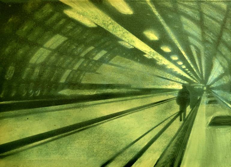 A zen moment. Traveling through the network of tunnels on the London Underground system late at night, early in the morning. I'm in a perfectly curved tube with gleaming steel and an autowalk. The painting is one of my early experiments with how to express an experience of something. Spray paint ...