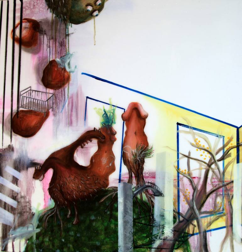 oil painting with clear resin on cotton canvas. The artwork is framed with white wooden edge. Surreal landscape with a mix of architecture, nature and deformed bodies and animals