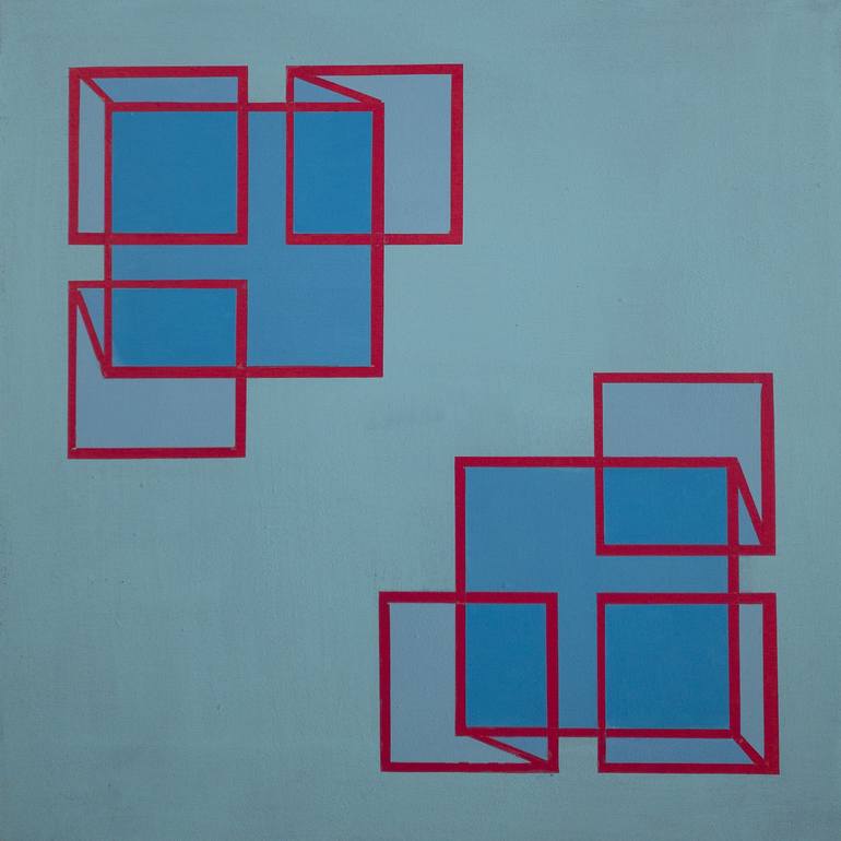 This is an acrylic on wood panel painting that was made using a reverse tape design. I painted the line color first, covered the pink in masking tape, drew the design, cut the tape, painted the various shades of blue, and then removed the tape over the line. I painted three of these panels simultane...