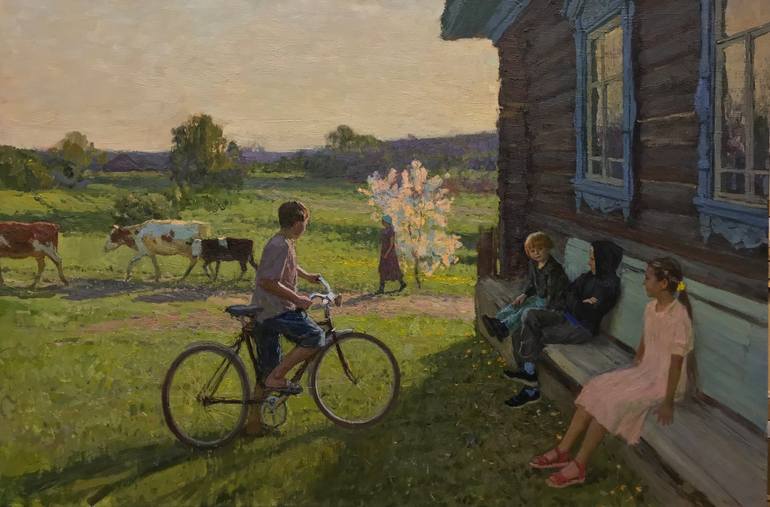 I painted this painting under the impression of a trip to the Urals. Children gathered at our house and played. I wanted to create a warm chamber painting.